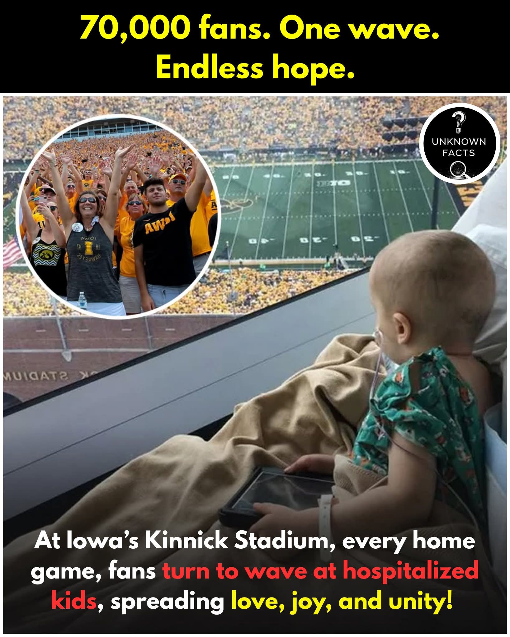 At Iowa’s Kinnick Stadium, home to the University of Iowa Hawkeyes, something extraordinary happens every single home game. While college football is known for its high energy, rivalries, and roaring crowds, this stadium holds a moment that transcends sports. It is a moment when more than 70,000 fans — players, coaches, and spectators — pause the excitement, turn away from the field, and direct their attention toward the Stead Family Children’s Hospital. With hands raised high, they wave to the young patients watching from the hospital’s large windows. This touching tradition is known as the Hawkeye Wave, and it has become one of the most beloved and emotional gestures in all of college football.